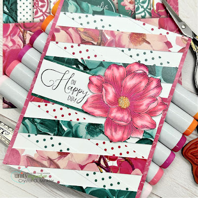 I used 1/2" strips for this one too. The strips were all adhered to the panel and I trimmed off the excess. And then I adhered the panel to a mat of pink pattern paper from the paper pack. The card front was then adhered to a white A2 top fold card base.