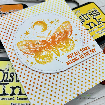 I stamped the sentiment on a scrap of white card stock using Candied Apple Distress Ink. I trimmed up the sentiment cutting a fishtail at one end. I adhered it to the circle and then I added foam tape to the back of both pieces and popped them up on the card. I like to use a thin foam tape from Scrapbook Adhesive. It gives a bit of dimension but it's not too bulky to mail the card in a regular A2 envelope.